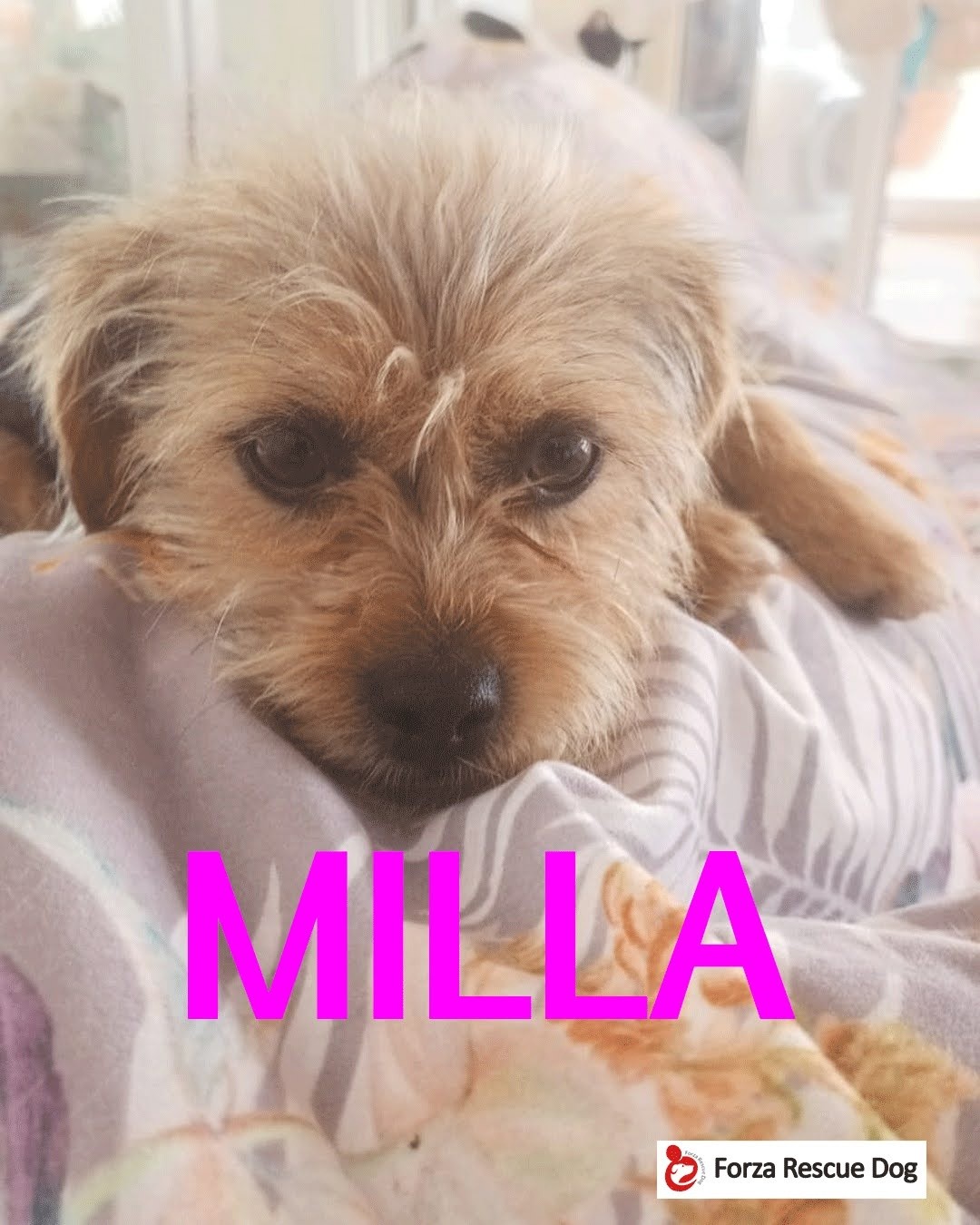 MILLA è una piccola Yorky di 2 anni. Molto socievole, simpatica e affettuosa. Ok gatti Una nostra volontaria l’ha trovata davanti alla sua porta, affamata e senza chip. Le analisi per le malattie mediterranee sono negative. Cerca casa Per chiedere di lei +41 79 367 29 80 +39 348 9194998